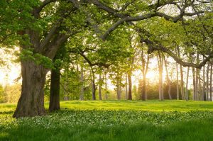 Sunlight in the green forest springtime