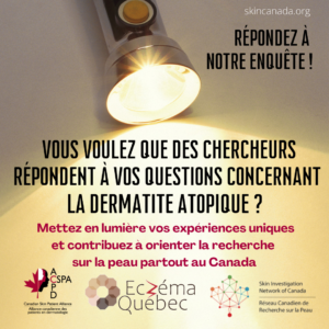 Enquête sur la dermatite atopique en collaboration avec SkIN Canada Répondez au sondage et faites-vous entendre! La SCE collabore avec le Réseau canadien de recherche
