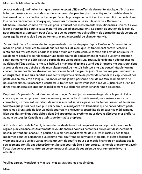 Mike L. a récemment rédigé des lettres au ministre de la Santé et à ses députés provinciaux. Il a généreusement partagé ses lettres avec la SCE. Elles sont d’excellents exemples de messages à livrer à vos représentants, et nous vous invitons à suivre le même format lors de la rédaction de vos lettres :